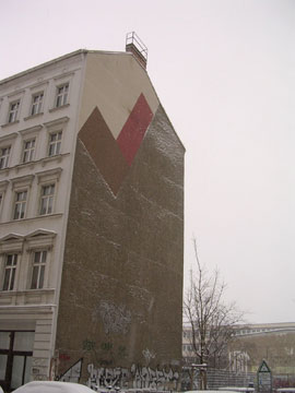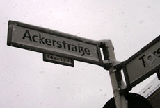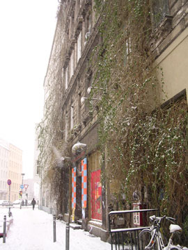 東京の雪ってぼたぼたしてる感じで、風でふわーっと舞うような細かい雪は見た覚えがなかったから、ただ風が吹いても感動する。 そんな雪の中を、年末の買物のために出かけた時に通った道がAckerstr.。 スーパーマーケット砂漠のHackescher Markt駅周辺で、唯一、毎日新鮮な魚を仕入れ、野菜をずらりとそろえている大きなスーパー、 アッカー・ハレがあるので、ここはちょくちょく通る道なのだが、雪がふっていると、驚く程『東っぽい』。 ミッテ地区にあるこの道は旧東ベルリン側なのだが、普段は建築のギャラリーや、洒落たイタリアンレストラン、高級食材店、美容室、 レストラン、ワインショップなんかが軒を並べ、洗練された新しい東、の顔を見せている。 しかし雪にふりこめられ、ほとんど色を失ってモノトーンになっていることと、年末で店屋がほとんど閉まっているので閑散とした雰囲気で、 それが、『壁があった時代の東ベルリン』を感じさせたのだ。 写真を撮ろうとカメラをかまえたら、たまたま目の前に停まっていた車は東独製の車、トラバントだった・・。 普段は対して気にならなかったが、雪のせいで、ぼんやり白いふちどりになっている壁画も面白い。 ベルリンには、誰が描いたのかもわからない壁画がよくある。グラフィティみたいなものから、アーティストが描いた、例えば、近付いてくる爆撃機の影をビルの壁に描いたものなんかもある。 (Oranienburger Strasseのタヘレス横の壁。最初見た時はちょっとぎょっとした。) この道にあるのは、マレーヴィチの抽象画みたいな、ビルの色を生かした上に長方形がななめに組み合わされているだけのもの。 壁画じゃなくて、壁に残っている階段の跡や、広告のペンキ絵がはげたみたいな壁も、時々ものすごく味のある良い風景になってるのもみかける。 雪は、古本屋の、年代物の木の扉にもふりつもる。つたが絡まったもじゃもじゃのビル、Schokoladen(裏にシアターなんかもある)の枯れたツタにも雪が。 このビルの1階部分は、ピンクのバラが毒々しく描かれていたり、金色のデコレーションがほどこされていたり、キッチュな色合いなのだが、 ツタと雪のおかげでかなりやわらかい印象だ。 普段、雪が無い時には、さっさとスーパーまで歩き、気がむけばギャラリーを外から覗き、時々イタリア食材の店に足を踏み入れるだけなのに、 雪がふったら、今まで目にとまらなかったものがみえるようになってきた。 2006年、年があけてから通ってみると、雪は溶け、道中に大晦日のロケット花火の焦げたカスが通行人に踏み荒らされて、道はきたならしい色だった。 居並ぶビルは、雪によってワントーン落ちた色合いになっていたのが、ちょっと濃くなって、やっぱり『今のミッテ』っぽくて、なんというか、違う顔つきをしてた。 また雪がふったら、Ackerstr.を通ってみたい。 |