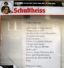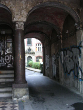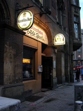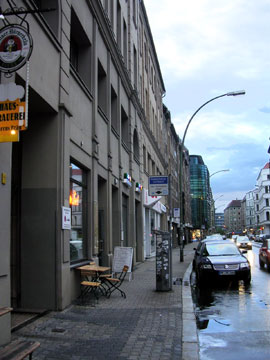 Muenz、がMuenze となると小銭、の意。小銭通りって意味なのだろうか?小銭というと、漫画、『エロイカより愛をこめて』のJムス君を思い出す。 作者の青池保子先生は、なんとドイツのエーベルバッハ市から観光に貢献したとして表賞されたんだったか、名誉市民にされたんだったか、とにかくすごい。 最近、彼女のエッセー集、『エロイカより愛をこめての作り方』を読んだら、この漫画が、ドイツ軍発行の雑誌で紹介されたと書いてあった! (主人公がNATO軍の少佐なので)すごい!青池先生、ベルリンに来ないかなあ〜。 話がずれたが、この道はゲーテ・インスティテュート時代毎日のように通った通り。 というのは、この通りに好きなベトナム料理店があってそこで毎日のようにお昼を食べていたから。 そのベトナム料理店では当時、毎週土曜日のみ生春巻きを出していて、これがすごく美味しくて毎週のように食べていたら、いつからか毎日出るようになった。 この店ではこの生春巻きだけをテイクアウトする人も多く、人気メニューなのだと思う。友達皆ここの生春巻きのファンだったが、ある日、相方がこの生春巻きを食べ、 ものすごい食中毒を起こしてしまい、それ以来、他の店に行くようになった。 そのベトナム料理店に行かなくなってからも、この道はちょくちょく通る。アレクサンダープラッツに行きたい時は、この道を通って、 Rochstrasseを曲がって行くのが一番好き。 特に夕方、しっとりした空気、空がちょっと濃い色になりはじめてビルの色が一段深い色に変わる瞬間くらいに通ると綺麗。キレイといっても、この道はー清潔ーでは全然ない。 犬のふんとホコリ、水たまりとビール瓶のカケラがいつも落ちているような道なんだけど、それがこの時間に通ると、息づく、とでもいうのだろうか、 店の明かりと相まって実に暖かい感じに一瞬、変わるのだ。 夜になってイキイキしはじめるのが、昔、上の階にミュンツクルブがあった角。 このクラブはかなり人気があったのだけれど、警察の手入れにひっかかって閉店となった(と新聞で読んだ)イリーガルだったのか、 ドラッグでも売ってたのか、何にしろべルリンらしい話だ。そのビルの地階には、アルト・ベルリンという濃ゆい居酒屋がある。 イギリスのパブに似た、煮染めたような壁や机の色、妙にこだわりのありそうな服を着てるバーテンダー、煙草の煙りと立ち飲み客。 そこここに変な小さな飾りとかがある、統一感の無い内装は、客層によっては、アル中でサッカーファンのおじさんが集まる居酒屋になってしまいそうなギリギリの所。 本当はこっそり写真を撮りたかったんだけれど、それが許されない雰囲気が充満していたのでカメラを取りだせなかった。 で、その話をしたら、友達が、その居酒屋の前に貼ってある張紙を指差して、読んでみろという(張紙の内容は下を見てね)。・・・カメラ出さなくて良かった・・。 居酒屋の隣の、暗い道を入って、中庭に行くと、そこにはアンドレアス・ムルクディスというセレクトショップがある。 コスタス・ムルクディスの兄弟(どっちかは分らず)が手掛けるショップは、古いタイルが残る空間に、整然と商品が並んでいる。 セレクトは良いのだろうけれど、私にはとても高くて手が出ない。皮や銀のアクセも素敵。 奥の方の店には、ベルリン発の雑誌やプロダクト、チョコレートなんかが並んでてお土産にも良いかも。 店が、こんな所に人が住んでいるの?と思うようなボロいビルの影にあるのが、いかにもベルリンらしい。 そこを出ると、ベン・シャーマン、コンバース、アディダスといったメジャーなショップがずらずらと現れる。ビル部分は古いビルで、 店の部分だけが、ポーンとガラス張りのショーウィンドーになっているのがなんだか不思議なコントラストの場所だ。 ショップ群の中には、SHIBUYAという店もある。日本のキャラもの等も扱っている、多分、オシャレを狙いたかった店。 SHIBUYAって命名はちょっと・・足を踏み入れ難い命名だな。(と思っていたら、MTVと並ぶ音楽チャンネルVIVAで、カラオケ番組、SHIBUYAが始まった。) そんなのがある近くに、もう潰れてから何年にもなる、美容室がぽつりとある。『マニュキュア始めました』の破けたポスターが悲しい。変わる時代に付いて行けなかったのだろう。 さらに行くと、アレクサンダープラッツに向かう交差点に出る。この道はココで終わり。 ベルリンのアタラシものと東時代そのままのところが、ギザギザに噛み合ってるような、噛み合ってないような通りなのだ。 |