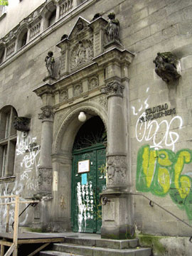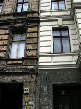 日本だったら忙しくて時間を合わせるのが大変だ。もしかしたら私の回りだけかもしれないが・・・。 この通りのあるプレンツラウアーベルクは、ベルリンの中でもここ数年の出産率が高い場所。 そしてこの通りは、Mauer Parkという公園に続いているため、昼間は子連れのお父さんお母さんがびっしりこのカフェにたむろする。 アイスクリームを、冬でも負けずに頬張って、ほっぺたをチョコでベトベトにして走り回っている子供達。手編みの帽子に、フェルト地のコート、ブーツ姿のお母さん。 この通りは、ある意味“プレンツラウアーベルク”の典型の風景のような気がする。 歩いて居る人の年齢層とか、服装もそうだし、建物もそうだ。 プレンツラウアーベルクは、東西壁崩壊後、東がオシャレで“若者に人気の街”になりはじめた当初は、 まだそれ程開発が進んでおらず、『北斗の拳にでてくる荒漠とした街』だったそうだ。 しかし、ミッテ地区の地価が高騰した結果、必然的にお金の無い若い人達はプレンツラウアーベルクに移り住むようになる。 急に人気となった地区のアパートは外側だけでも!とお色直しされ、プレンツラウアーベルクの住居の多くが、 駄菓子のようなキッチュなパステルカラーに塗り直されているのだ。しかし、お色直しは住居部分の2階から上だけ。 1階に入っている店鋪は店のオーナーの自費改装が多いので、店によっては外観はぼろぼろのまま、内装だけを改装をしているところも多い。 そのパステルと戦争中の弾痕が残る壁とのちぐはぐなモザイク模様が、この通りの特徴だ。 手前はピカピカなのに、横の壁はぼろぼろだったりもして、なんかいい感じにチグハグしてる。 通りは、カスターニエン・アレーを挟んで、カフェ等が集まっている方と、空地がある方にわかれている。 空地のある側には、古い市立プール(下左)がある。 ここは今はプールとしてではなく、イベント・ホールとして使われていて、 その音響効果と空間の面白さから、 コンサートなんかも行われているようだ。 文化財保護指定されているが、外側はグラフィティだらけ。 保護されているのか、よくわからないところが、これまたベルリンらしいような気がしたりして。 |