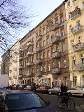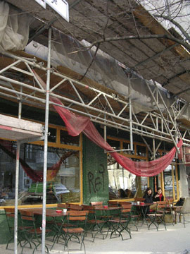 確かに子どもの年齢は10才くらいから3才くらいまでの間が多い。15年前に壁が倒れた頃から逆算すると、なるほどね、とうなずける説だ。 ラウマ−・シュトラーセは、歩けばかならず乳母車をひいたお母さんお父さんにあう道。オモチャ屋さんなんかもあるし、カフェも多い。 苺アイスみたいなピンクや、マーブルチョコみたいな人工的なオレンジや青にお色直しされたビルと、ぼろぼろのビル、工事中のビルが並ぶ街並。 工事現場の下にまで頑張ってテーブルをだし、オープンカフェしている所もある。 このカフェは、ネットカフェなのだが、水パイプが試せて、わりと美味しいアラブ風の前菜やサンドイッチが食べられる。 私は煙草吸わないので、フレッシュミントティーとファラフェルやフムス(豆のムースみたいなスプレッドみたいなモノ。パンにぬって食べると美味しい)を食べる。 カフェの前にあるアンティークショップは小さいけれど、かわいい掘り出し物があるので、いつもちょっと覗く。 1冊1ユーロの本が並ぶ古本屋なんかもある。ちょくちょく覗くベルリン発のレーベルを沢山揃えているセレクトショップもある。 アンティークショップの隣にも小さな細いスペースにカフェだかブティックだかがあった。 ここらへんは、なんというか、オルタナティブな、手作り、“ちょっと思いついて、やってみた”感覚の店が多いところだ。 カフェの看板なんかも絵の具でなぐり書きだったり、オープンカフェ用の椅子もなくて板を適当に張り付けて座れるようにしているところもある。 こういうのベルリンの人は好きだ。お皿とかも欠けてたり、ソファーもぼろぼろだったり。 最初の頃は、えーこんなんと思ったけど、徐々にこういう方が好きになった。 未だに慣れないのは、スーパーの汚さだけ。安いスーパーに入って、暗いランプに照らされた、適当に積まれた箱から商品を掘り出したり、ごちゃごちゃと突っ込まれた冷凍肉の固まりとかを見ると、イマイチ食欲が湧かない。 多少高くても、とりあえず明るくて、きちんと商品が棚に並んでいる店に行きたい。 もちろん、安いから不味いこともないし、ダメなこともないとは分かってても、だめだ。 ラップがきちーんとかかって、ぴかーっと並んだ日本のスーパーに慣れ過ぎているのだ。 でもカフェの手作り感は良い。蜂がたかっているケーキは美味しい証だし、カップとお皿が揃って無くても美味しいコーヒーが出てくれば文句ない。 店員が客そっちのけで、ずーっと自分の友達と話してても、まあいい。その店と、お客の作り出す雰囲気が心地よければ良いのだ。 気合いが入り過ぎて無いカフェは、こっちも居てのんびりするから、ゆっくりできる。 何をするでもなく座って、考え事したりする。友達と会ったり。天気がよければ、ヘルムホルツ広場で遊んでる子どもを見ながら散歩する。 なんだか毎日日曜日みたいな通りだ。 |